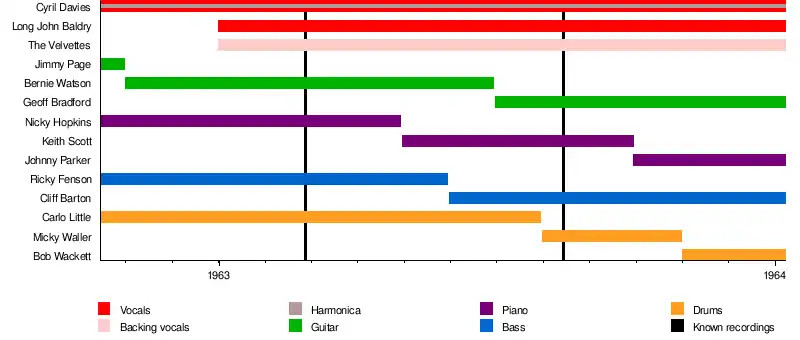 In May 1963, illness forced the departure of Hopkins as he was hospitalised for several months.[2] Former Blues Incorporated pianist Keith Scott was recruited in his stead, but growing tensions between Davies and the other band members meant that Fenson, Watson and Little each soon left the group to be replaced by bassist Cliff Barton, guitarist Geoff Bradford and drummer Micky Waller.[2]