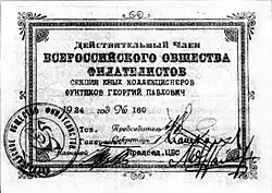 All-Russian Society of Philatelists (Russian: Всероссийское общество филателистов) was the first national philatelic organisation in Soviet Russia established in 1923. Later on, it was subsequently renamed and reorganised into the All-Union Society of Philatelists (Russian: Всесоюзное общество филателистов)[b] and the All-Union Society of Collectors (Russian: Всесоюзное общество коллекционеров).[1][2]
