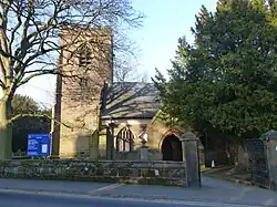 The church is built in red sandstone with a slate roof.[1] The architectural style of the body of the church is Perpendicular.[a] The plan of the church consists of a five-bay nave with north and south aisles, a tower at the west at the end of the nave, and entrances opposite each other in the north and south aisles.[1] The tower has corner buttresses and is crenellated. On its top is a weather vane in the shape of a fish. The west window is plain with four lights and the belfry windows are also plain with two lights. The date 1110 is carved on the south side. It is thought that this date was originally 1550 but that the number had weathered and it was mistaken by restorers.[10] At the east end of the south aisle is the Daniell Chapel. The chapel had formerly been called the Chadwick Chapel but its name was changed to the Daniell chapel to commemorate one of Cheshire's ancient families who had connections with Daresbury.[5]