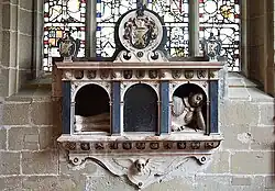 There are very fine memorials, mostly for the local Trevalyn Hall branch of the powerful North Welsh Trevor (Trefor) family.[5] An alabaster effigy of Sion Trefor (d. 1589) reclines within a classical framework, a long tablet inscribed in Welsh appearing to hide the middle of his body. His daughter-in-law, "Dame Katherine Trevor" is represented twice, once painted and half life-size, kneeling next to her husband Sir Richard Trefor (d. 1638), and also kneeling with daughters in a smaller relief.
