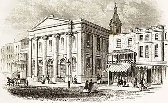 The frontage measured 60 feet 6 inches (18.44 m) wide and had four columns which measured 4 feet (1.2 m) in diameter by 36 feet (11 m) high. The columns were topped with Grecian pilasters and supported a pediment.[7] The lower part of the three spaces between the four pillars were filled with wide arches, with the entrance doors topped with fanlights below them. The building had staircases on each side, lit by semi-circular headed windows between the outer columns and the pilaster.[7]