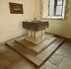 The massive and ornate Tournai font of c. 1130–40,[8] like three others in Hampshire (Winchester Cathedral, St Michael's, Southampton, and St Mary's Church, Bourne) and three elsewhere in England,[7] is made of Tournai marble (not strictly a marble but a dark limestone).[2] It was probably a gift to the church from Henry of Blois, Bishop of Winchester.[9] The Romanesque friezes on its sides, carved by Flemish masters, depict the creation of Adam and Eve and the Temptation (N face); the Expulsion from the Garden of Eden and Adam being shown how to dig (E); and various animals, birds and dragons on the S and W faces.[8]