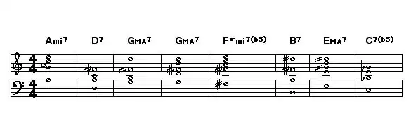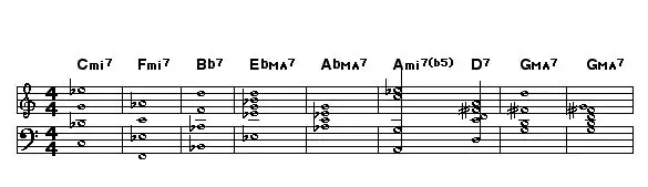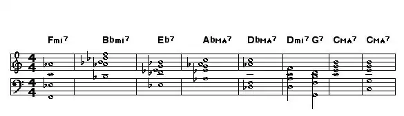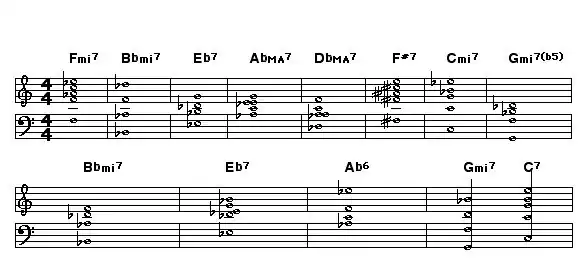 Note: The harmonic analysis demonstrates a functional chord progression using the circle of fifths. This type of progression generally relies on the roots of the chords being a 4th apart. Taking the main key of measures 1 to 5 as A-flat major, the chords can be considered as vi–ii–V–I–IV in A-flat major. (Fm7 is the sixth degree in A♭; B♭m7 is second degree in A♭, etc.) Using a delay cycle, D♭ being the tritone substitution for G7, the last 3 bars of the A section modulates to the key of C major temporarily.