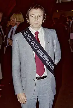 ![]() Allan Rogers wearing a black sash to protest rising unemployment in the UK, 1983 | |