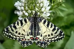 The Allancastria cretica imago is a medium-sized ( 50–60 millimetres (2.0–2.4 in) long.,[1] white to ochre-white butterfly with black markings, a line of submaginal scallops, and a few red dots on the hindwings. Seitz_-cretica Reb. (9e) occurs on Grete and some Greek islands; a sparsely marked form in which the three teeth of the hindwing mentioned above (A.cerisyi) are indicated only by black curved lines, the edge of the wing not being distinctly excised. Not so common as cerisyi.[2]