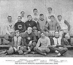 The Allegheny team was assembled in 1890.[1] At that time, athletic clubs and associations, ranging from the best with extensive facilities to local organizations with minimum meeting rooms, were in their prime as a source of fraternal fellowship for athletes. In most sports, Allegheny provided very little competition for the more established East End Gymnastic Club (EEGC), which in 1892 became the Pittsburgh Athletic Club. Allegheny soon took up football largely when the club discovered that it could give them a recruiting edge over the East Enders. Many Allegheny club members had gone to eastern colleges and played football. Members O. D. Thompson, who had become a successful Pittsburgh lawyer, and John Moorhead Jr. were former teammates of Walter Camp, the inventor of the modern game. The team immediately gave Allegheny a strong following. Allegheny's backfield during that inaugural year had A. S. Valentine at quarterback, two track stars in Harry Oliver and Harry Fry as the halfbacks, and O.D. Thompson at fullback.
