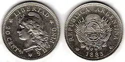 A slightly different version appears on the banknotes of fifty cents m$n, in circulation between 1942 and 1960. This effigy can be compared with the design of Oudiné, and considered inspired by Liberty Leading the People. The Liberty of Oudiné also appears in the logo of the Central Bank of Argentina, and the former company Gas del Estado. It is also used in the seals of the Internal Revenue law present in cigarette packs.