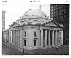 The Girard Trust Company Building (1905–07), at Broad & Chestnut Streets, Philadelphia, caused a rift between Evans and Furness. The initial concept for a bank building modeled on the Pantheon in Rome had been Furness's, but the bank's president rejected his participation: