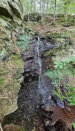 There are two small waterfalls to the west of Allensford on streams running south-to-north into the River Derwent. About 400m to the west on Allensford along a public footpath is Wharnley Burn Waterfall[10] on the Wharnley or Watergate Burn, pictured in this article. The footpath crosses a small bridge below the waterfall and continues south west into woodlands and eventually to farmland below Castleside.