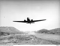 The first air transport mission to the Kokoda front was flown on 26 July, when a DC-3 from the 21st Troop Carrier Squadron landed 15 troops of the 39th Infantry Battalion and some stores. A C-53 followed that afternoon with another 15 men and some stores.[151] The flight time to Kokoda was about twenty minutes.[152] An air supply run the following day by a C-53 and a DC-2 found the airstrip barricaded. The barricades were removed, but the aircraft were recalled by a radio message that the Kokoda Drome could not be held. The loss of the airstrip meant a switch to air dropping supplies. An aircraft was sent that afternoon, but was recalled. On 28 July, a DC-5, a DC-3 and a DC-2 dropped supplies near Kokoda. Three transports dropped supplies near Kagi on 29 July, and one on 30 July. No more missions were flown until 6 August.[153][154]