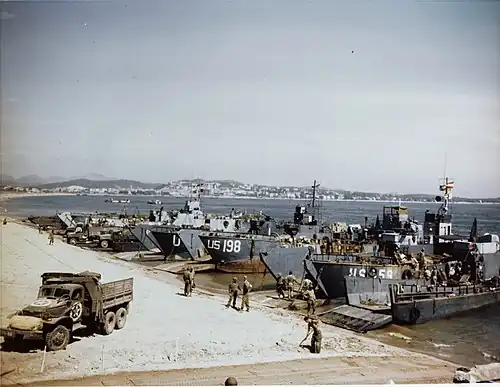 The first ship to dock at Toulon was the Liberty ship SS F. Marion Crawford, which began discharging on 5 September.[81] A second berth was ready the following day, and nine Liberty ship berths were available by 25 September, along with 31 bow-on sites suitable for LCTs.[96] The port was mainly used for the delivery of civil affairs supplies. By the end of September, 3,441 long tons (3,496 t) of military supplies, about 9,000 long tons (9,100 t) of civil affairs supplies, and 23,629 vehicles had been unloaded at Toulon.[81] Tonnage unloaded through the ports of southern France increased from 174,500 long tons (177,300 t) in August to 326,813 long tons (332,057 t) in September, 524,894 long tons (533,317 t) in October, and 547,602 long tons (556,389 t) in November.[97]