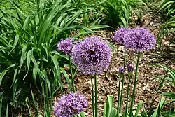Allium aflatunense is a 0.9 m (36 in) tall bulbous perennial plant with basal, straplike leaves, and hollow, slightly ribbed scapes (flower stems).[1] The flower heads are dense, globular umbels, about 10 cm (4 in) across, made up of numerous star-shaped, purplish-pink flowers.[1] It flowers in May and June, with seeds ripening in August. It is commonly sold as a bulb.