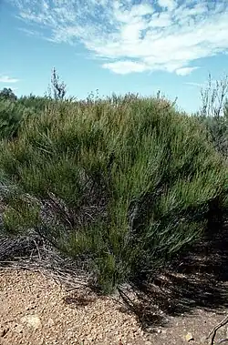 Allocasuarina campestris is a dense, erect, monoecious or dioecious shrub that typically grows to a height of 1–3 m (3 ft 3 in – 9 ft 10 in). Its branchlets are more or less erect, up to 200 mm (7.9 in) long, the leaves reduced to erect, scale-like teeth 0.3–1.2 mm (0.012–0.047 in) long, arranged in whorls of seven to nine, around the branchlets. The sections of branchlet between the leaf whorls (the "articles") are 6–13 mm (0.24–0.51 in) long and 0.6–1.2 mm (0.024–0.047 in) wide. Male flowers are arranged in spikes 4–28 mm (0.16–1.10 in) long, in whorls of 8.5 to 11 per centimetre (per 0.39 in.), the anthers 0.9–1 mm (0.035–0.039 in) long. Female cones are red to brown, covered with short, fine, white hairs when young, and are sessile or on a peduncle up to 5 mm (0.20 in) long. Mature cones are 19–42 mm (0.75–1.65 in) long and 10–17 mm (0.39–0.67 in) in diameter, the samaras black and 4.7–10 mm (0.19–0.39 in) long.[2]