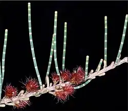 - Allocasuarina lehmanniana (Miq.) L.A.S.Johnson subsp. lehmanniana[11] has branchlets up to 200 mm (7.9 in) long, seven or eight teeth, the mature cones 13–35 mm (0.51–1.38 in) long and 9–12 mm (0.35–0.47 in) in diameter.[12][13]