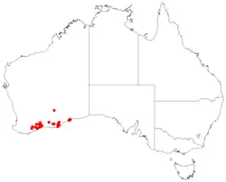 Allocasuarina scleroclada grows in scrub and low woodland, on rocky hillsides and on limestone shelves near the sea. It occurs in scattered places along the coast of Western Australia between Borden and the western part of the Great Australian Bight in the Coolgardie, Esperance Plains and Mallee bioregions of southern Western Australia.[2][3]