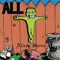 Allroy Saves was All's last album to be titled after their mascot, Allroy. The character, created and illustrated by Alvarez, had appeared on the covers of Allroy Sez (1988), Allroy for Prez (1988), and Allroy's Revenge (1989).[7][8][9] For Allroy Saves Alvarez drew Allroy crucified to a fence, his eyes crossed out, tongue hanging out, and skin color changed from its usual yellow to green.[2] Allroy would be absent from the band's following albums Percolater (1992), Breaking Things (1993), and Pummel (1995), but would be revived for Mass Nerder (1998), All (1999), and Problematic (2000).[3][10][11] Egerton did the graphics for Allroy Saves.[2]