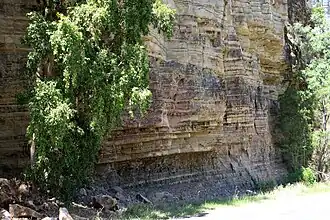 This stratigraphic unit includes green to brown, medium thickly bedded lithic sandstone with turbiditic sedimentary structures and interbeds of brown thinly bedded mudstone.[1][2]