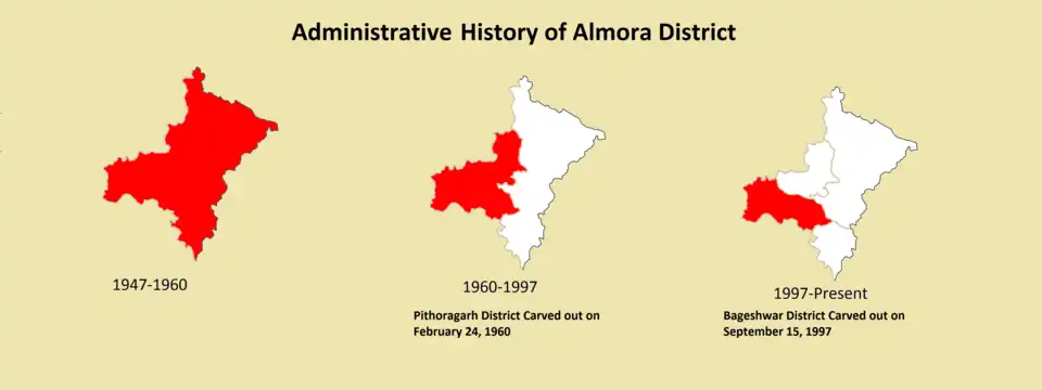 In the 1960s Bageshwar district, Pithoragarh district and Champawat district had not yet been formed and were part of Almora district.[6] Pithoragarh district was carved out of Almora on 24 February 1960 and Bageshwar district on 15 September 1997. In 2011, Ranikhet District was proposed to be carved out of the Almora District and has yet to come into existence.