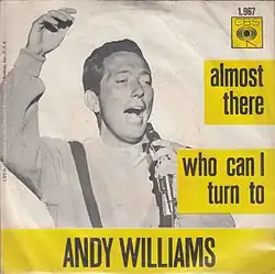 "Almost There" is a song written by Gloria Shayne and Jack Keller and performed by Andy Williams in his film I'd Rather Be Rich (1964). The song reached #12 on the U.S. adult contemporary chart and #67 on the Billboard chart in 1964. It also reached #2 in the UK in October 1965 for three weeks.[1] The B-side, "On the Street Where You Live", was also a hit, reaching #3 on the adult contemporary chart and #28 on the Billboard Hot 100.[2]