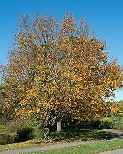 A shapely tree reaching 15 m (50 ft), with white flowers, red fruit, and yellow autumn foliage, it appears to be resistant to fire blight, and so is a good candidate for further development as an ornamental.[4] It is used as a street tree in Aarhus, Denmark.[5]