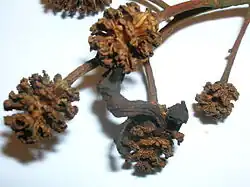The common alder is susceptible to Phytophthora alni, a recently evolved species of oomycete plant pathogen probably of hybrid origin. This is the causal agent of phytophthora disease of alder which is causing extensive mortality of the trees in some parts of Europe.[19] The symptoms of this infection include the death of roots and of patches of bark, dark spots near the base of the trunk, yellowing of leaves and in subsequent years, the death of branches and sometimes the whole tree.[16] Taphrina alni is a fungal plant pathogen that causes alder tongue gall, a chemically induced distortion of female catkins. The gall develops on the maturing fruits and produces spores which are carried by the wind to other trees. This gall is believed to be harmless to the tree.[20] Another, also harmless, gall is caused by a midge, Eriophyes inangulis, which sucks sap from the leaves forming pustules.[21]