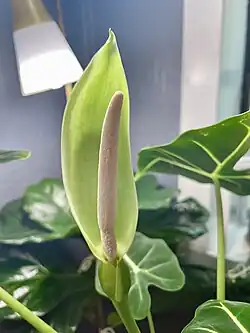 They can bear up to 4 flowers together, each around 20 cm (7.9 in) long. The spathe is around 14 cm (5.5 in) and greenish in color. The spadix is shorter than the spathe and cream-colored.[2][3]