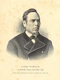 Following this he repeatedly and unsuccessfully attempted to win election to the Council of States.[2] Wyrsch's political career on the cantonal level remained successful, and he served as a member of the executive council of Nidwalden for twenty-seven years, including twelve as president.[2]
