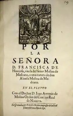 - ^ a b Hinojosa y Montalvo, Francisca de; Heylan, Francisco; Molina Medrano, Juan Antonio de; Perez de Lara, Juan (1630). Por la señora D. Francisca de Hinojosa, viuda del señor Molina de Medrano, como tutora de don Alonso Molina de Medrano, en el pleyto con el doctor D, Iuan Antonio de Molina oydor del Consejo Real de Nauarra. Biblioteca de la Universidad de Sevilla. En Granada : por Francisco Heylan.