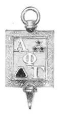 Alpha Phi Gamma's badge was designed by member Edward Steinberg.[2] It was a rectangular key with the three Greek letters ΑΦΓ diagonally from upper left to lower right, three stars in the upper right and an inkwell in the lower left.[3] Its coat of arms included three wreaths quill-surmounted inkwells and a secretary bird at the crest.[3] The pledge emblem was a white bridge emblem with Alpha Phi Gamma inscribed in black.[3]