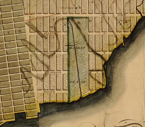 "In general," the commissioners resolved, everything "should be rectangular."[42] However, the new roads were rotated relative to the existing ones just below Alphabet City. Moreover, the commissioners could do little to straighten the shoreline. They were limited by charter to reclaiming 400 feet beyond the low-water mark, much less than the Mangin-Goerck plan entailed.[43] First Avenue reflected this limit. It was drawn parallel to Fifth Avenue (called Middle Road in earlier designs[44]) as far east as possible while not straying too far into the water. Irregular bits of land protruded beyond First Avenue and, for these cases, the commissioners turned to lettered avenues. Avenues A and B appeared around Alphabet City, popped up again above midtown, and once more in Harlem (they were eventually renamed or eliminated above Alphabet City). Avenues C and D existed only in Alphabet City. Thus the neighborhood was misaligned with the old grid and relatively disconnected to the new one.