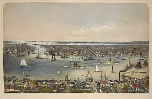 In 1828, an observer wrote, "No place on this island has the destroying hand of man done more to alter the face of nature... Hills of great magnitude have been entirely levelled, or cut down, and used to fill up docks and wharves."[86] By the early 1840s, the shipyards formed a solid line along the riverfront,[87] jutting out several hundred feet from the former low-water mark of the marsh. Shipbuilders included Smith & Dimon (4th to 5th Street), William H. Webb (5th to 7th Street), Jacob A. Westervelt (7th to 8th Street) and William H. Brown (11th to 12th Street).[88][89][90] Alongside them were sparmakers, who built masts for the booming clipper trade, as well as iron works, which manufactured steam engines. Morgan Iron Works (9th to 10th Street) and Novelty Iron Works (12th to 14th Street) soon became the area's largest employers.[91] Novelty had about 1200 workers at its peak in the 1850s, and was regarded as a marvel of engineering and operations.[92][93]