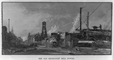 Throughout this period, the industry was dominated by in-migrants drawn to the booming shipyards from surrounding countryside and boatbuilding regions across New England.[105][106] They shared a traditional production model in which artisans progressed from apprentices to journeymen to masters, all while living and working side by side. Sean Wilentz, who documented the sweatshop proclivities of antebellum New York City, points to shipbuilding as the rare industry where tradition persisted and kept wages, skill and respect generally high.[107] He and others also credit shipyard workers with pioneering the reduction of work hours in the United States. A "Mechanics' Bell" hung for decades along the Alphabet City riverfront to enforce the ten-hour day that journeymen secured around 1834.[e] Labor reformer George McNeill likened it to a "'Liberty Bell' ... for the sons of toil."[111]