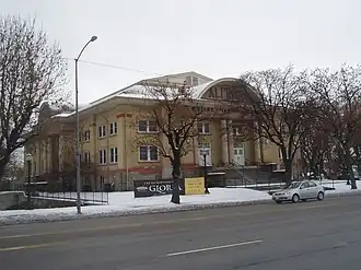 Plans for the tabernacle began soon after the formation of the Alpine Stake and drawings were made by the architectural design firm Liljenberg & Maeser.[2] Construction on the foundation began in 1909 and the cornerstone was dedicated in 1910 by Orson F. Whitney. The structure was completed in 1914 at a cost of $80,000 and dedicated the following year in 1915 by LDS Church president Joseph F. Smith.[3] The exterior is built with stone, red sandstone and yellow brick and does not feature a tower or steeple. The interior seats about 2,000 and retains much original decoration. Like many of the church's tabernacles, it houses a grand pipe organ. It also was built with a baptismal font. The tabernacle was extensively remodeled at a cost of $230,000 in 1962 and rededicated by Henry D. Moyle.[4] It was remodeled again in 1982. In 1994, the tabernacle was closed for a period of time while renovations were undertaken, including an extensive asbestos abatement. The tabernacle reopened in 1995 and continues to function as a tabernacle and hold various civic meetings.