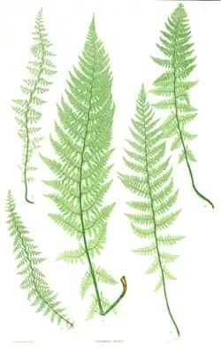This plant is light green with a somewhat upright rootstock. The leaves, 30-70 cm, form as fascicle at the tip of the rootstock. The petiole is at most a fourth of the length of the leaf blade and scaled. The leaf blade is narrowing towards both the base and tip, repeatedly double pinnate. The leaflets are acuminate and pinnules are serrate or pinnately lobed. The sporangium are on the underside of the leaves in indusium-less sori.[1]