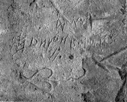 According to Vékony, the inscription was made by a Kabar leader, whose religion was Karaite.[12] The first symbol of the first row is a ligature, its transcription: atlïɣ.[13] The first symbol (from left) in the second row is a Khazarian word separator.[14]