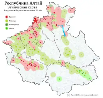 As per the 2021 Census,[22] ethnic Russians make up 53.7% of the republic's population, with the indigenous Altai people making up 37.0%. Other groups include people of Kazakh (6.4%), together with smaller groups, each accounting for less than 0.5% of the total population.