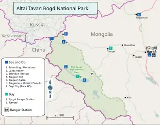 Altai Tavan Bogd National Park (Mongolian: Алтай Таван богд байгалийн цогцолбор газар, ᠠᠯᠲᠠᠢᠲᠠᠪᠤᠨᠪᠣᠭᠳᠠᠪᠠᠶᠢᠭᠠᠯ ᠤᠨᠴᠣᠭᠴᠠᠯᠠᠪᠤᠷᠢᠭᠠᠵᠠᠷ Altai five saints nature complex) is a national park in Bayan-Ölgii Province of western Mongolia. The park includes the Mongolian side of the Tavan Bogd massif, which is divided by the triple border with Russia and China in the Altai Mountains.[1][2]