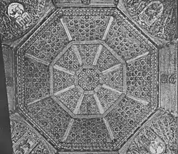 The fourth room had a coffered ceiling in worse condition than the previous ones, simpler in shape and details, and its lower frieze, with an ogival design, was not very wide, with painted bands rising above it and the pendentives in the angles to support the octagonal dome, which had no divisions and was decorated with geometric tracery.[2]