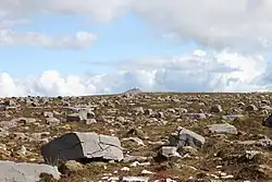 - A stone cairn. Described in the ‘Archaeological Inventory of County Cavan’ (Site No. 123), Patrick O’Donovan, 1995, as- An almost circular cairn (diam. c. 16m; H 3.2m). The NE half of the site is enclosed by the remains of a substantial drystone wall. Situated on the summit of Cuilcagh Mountain on the border between counties Cavan and Fermanagh. The site was known as 'Lacht a mhac a whoole' commemorating McEnhill, chief of a clan driven out of Tyrone by the O'Neills. According to tradition the cairn was used as an inauguration site by the Maguires. In the late forties of this century workers tossed some stones and built a triangulation station on top of the monument (Glangevlin Guild ICA 1983, 42). There are three hut sites a short distance to SE (CV006-003001-, CV006-003002-, CV006-003003-). The website Glangevlin.com states- On the top of Cuilcagh are two monuments about three miles apart, one of which is only a small one called Lacht an Phelim from Phelim O'Dolan who was an ancient proprietor of Gleann Gaibhle. It was erected some centuries ago. The O'Dolans.were a wealthy family and owned the townland of Gub. The larger monument was known as Lacht a mhac a' Whoole from a ‘mac a' Whoole’ [McEnhill in English) the head of a clan who were driven out of Tyrone by the O'Neills centuries ago and fled to the mountains with a party of followers and stayed there until they were betrayed. This monument resembles a fort surrounded by a large wall of dry stone. Near this erection bee-hived shaped huts can be seen. These were probably built by the Tyrone clan. Some say that writers used them and that one night a terrible storm of thunder and lightning broke out and that those writers fled and never returned. In the late forties of this present century workers tossed some stones and built a triangulation station by night on the top of the monument. A date, June 11, 1949, is quite visible. Other stations were built at the same time all over Ireland and were used to map the country. In the fifties other work was carried out by night. Those monuments form part of the border between Cavan and Fermanagh but it is easier to reach them from the Cavan side. Dean Henry climbed in 1739 from this side. Many schools and colleges organise bus tours to the large monument as it is a tourist attraction. St. Patrick is said to have prayed at the Monument.[23]