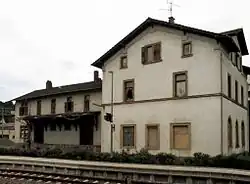 During the construction of a line to Kusel between 1862 and 1868, the station received a two and a half storey entrance building to the west of the tracks, which were originally equipped with rooms for staff accommodation and administrative offices. The architectural style contains elements of neo-classicism and was built in the style of the other Palatine stations that were built in the 1860s and 1870s, such as the Alsenz Valley Railway opened in 1870 and 1871 and the Germersheim–Landau railway opened in 1872. Due to the importance of the station, the execution was carried out exactly as in Glan Munchweiler and Kusel on a relatively large scale. The ground floor has windows and doors built in the round arch style (Rundbogenstil). Plasterwork is applied to the exterior walls. Later, the station underwent some structural changes. Originally it had a wooden porch, which was dismantled in the meantime. The main building is connected by a loading ramp to a freight shed, which was built with the slope of its roof facing the track. This building was later extended.[28] The precinct has heritage protection. Its address is Eisenbahnstraße 3.[29]