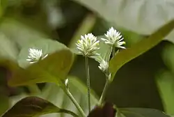 Its vanilla-coloured, pom-pom flowers are ordered in compact clusters (7–20 mm long) in the top leaf branching and are small in shape. These clusters are rounded to slightly lengthened in shape and are foaled on stalks which are normally 3–10 cm long. It can flower any time of the year, but in temperate and cooler subtropical climates it flowers more often in winter.[5] Its very small brown fruit (1.5–2 mm long) contains one seed that's generally hidden within the older flower parts.[6]