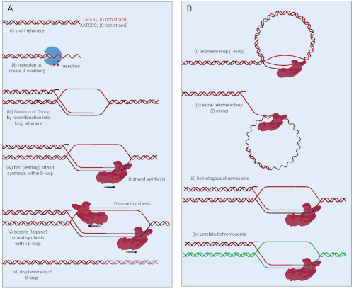 In proposed models for how BITS works, the process begins with the resection of a damaged telomere end: one of the strands is cut away to provide a single strand of DNA (the Guanosine-rich strand) that can bind to into a matching (homologous) template, forming a so-called displacement loop (D-loop) (Figure 1a).[2] In ALT, there is evidence that this template consists of: (i) a centromere proximal sequence of the same chromosome (T-loop), (ii) circular extrachromosomal telomeric sequences (C-circles), (iii) homologous chromosomes, or (iv) other chromosomes (Figure 1b). ALT may arise from a combination of some or all of these templates.[3] Importantly, because telomeres are highly repetitive, invasion between or within telomeres is not limited by the requirement for extended homology in homologous recombination. After D-loop formation, DNA polymerase δ extends the invaded G-strand end, copying material beyond the original breakpoint, leading to initiation of lagging strand synthesis of the C-strand, also by DNA polymerase δ.[4]