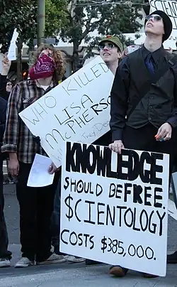 2008 protest against the Church of Scientology, spelling the organization's name with a dollar sign instead of an "S"