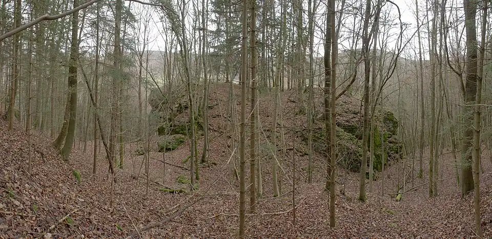 The simple site of the spur castle lies at around 450 m above sea level (NN) on a rocky crag on the hill of Zaunsbacher Berg that juts northwards into the Trubach valley. (Image 3). It thus lies about 130 metres above the valley floor and is densely wooded today (Image 2).[3]