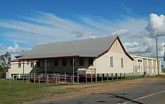 The foundation stone for an Anglican church was laid on Sunday 20 January 1907.[10][11] St James' Anglican Church opened in April 1907.[12] The church was 34 by 22 feet (10.4 by 6.7 m) and 13 feet (4.0 m) high inside with a front porch and vestry. It was built by R. Cousins & Co using tongue-and-groove dressed hardwood.[13]