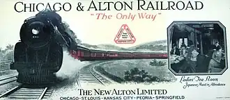 By 1905, it provided regular, daily service with six new cars strikingly decorated in three shades of maroon with gold stenciling, which led to the nickname, "The Red Train." The six-car consist included a RPO car, a combine car, a coach, a diner, and two Pullman parlor cars, one of which was the observation car.[1] The cars were richly appointed, and the Alton Limited was advertised as "The Only Way" and as "The Most Beautiful Train In America!"[2]