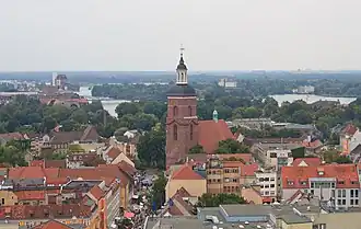 Altstadt Spandau is the historic centre (old town) of the Spandau borough in the western suburbs of Berlin, situated on the right bank of the Havel river by its confluence with the Spree tributary. It arose near the site of a former Slavic gord during the German eastward expansion (Ostsiedlung) in the early 13th century. A castle at Spandowe, erected on a Havel island to secure the eastern borderlands of the Margraviate of Brandenburg, was already documented in an 1197 deed issued by the Ascanian margrave Otto II.