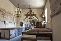 Inside, the church displays a set of wall paintings carried out at the end of the Middle Ages, probably just before the reformation and possibly by the same artist who decorated Lau Church. Among the furnishings, the dominating triumphal cross, dating from the middle of the 13th century, and a partly preserved baptismal font, executed by the Romanesque workshop or sculptor referred to as Hegvald sometime during the end of the 12th century, are especially notable. The pulpit dates from 1740 and the unusually decorated altarpiece from 1653.[2]