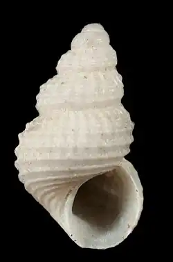 Sculpture: on the penultimate whorl there are four slender but well-defined spiral ridges, the lower three of which arc stronger than the highest one, which is on the upper slope of the whorl. The ridges are crossed by about twenty-eight perpendicular ribs, not so much elevated nor nearly as strong as the ridges.They form with them square cancellations, the intersections of the ridges and ribs being scarcely raised, but slightly nodulous. The apical whorls are marked with spiral rows of close angular punctures. In each succeeding row the punctures lie below the ridges separating those of the preceding row. The base of the lowest whorl has 5–7 spiral ridges, for the most part uncrossed by the ribs, which generally terminate at the line of the upper part of the aperture.[1]
