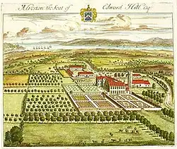 Alveston Manor House, drawn by Johannes Kip, c. 1712. Alveston Old Church of St Helen is visible next to the house.